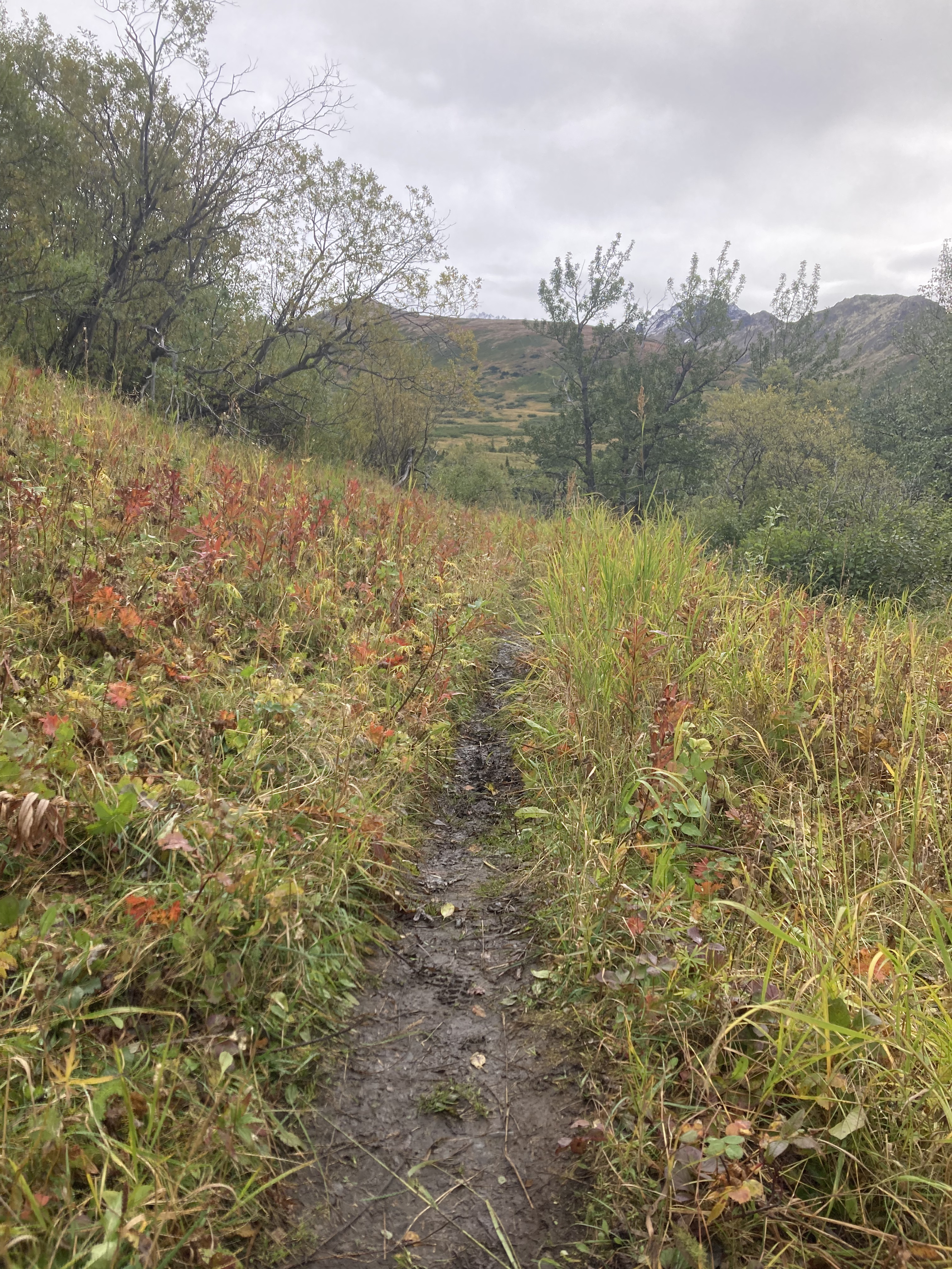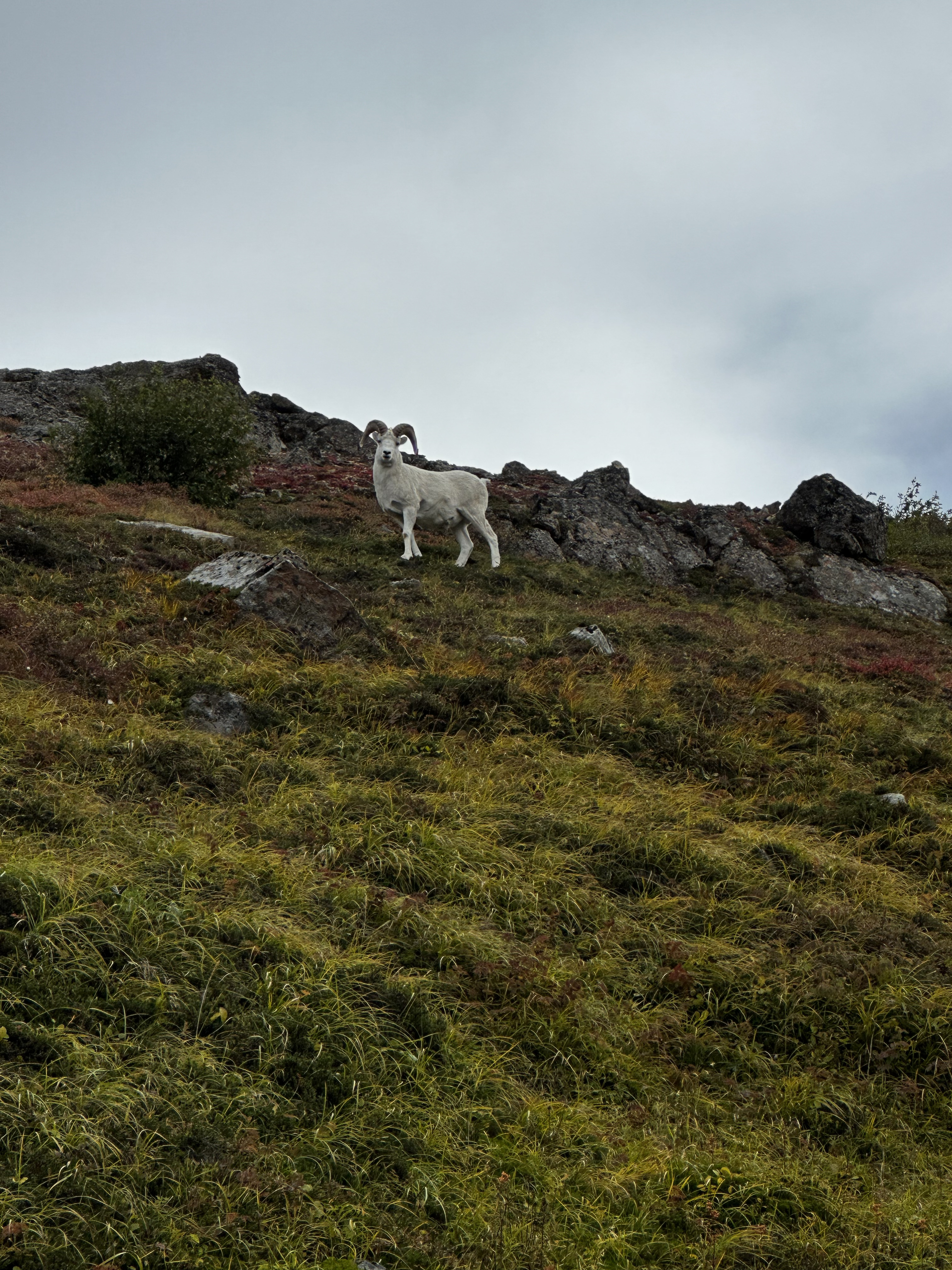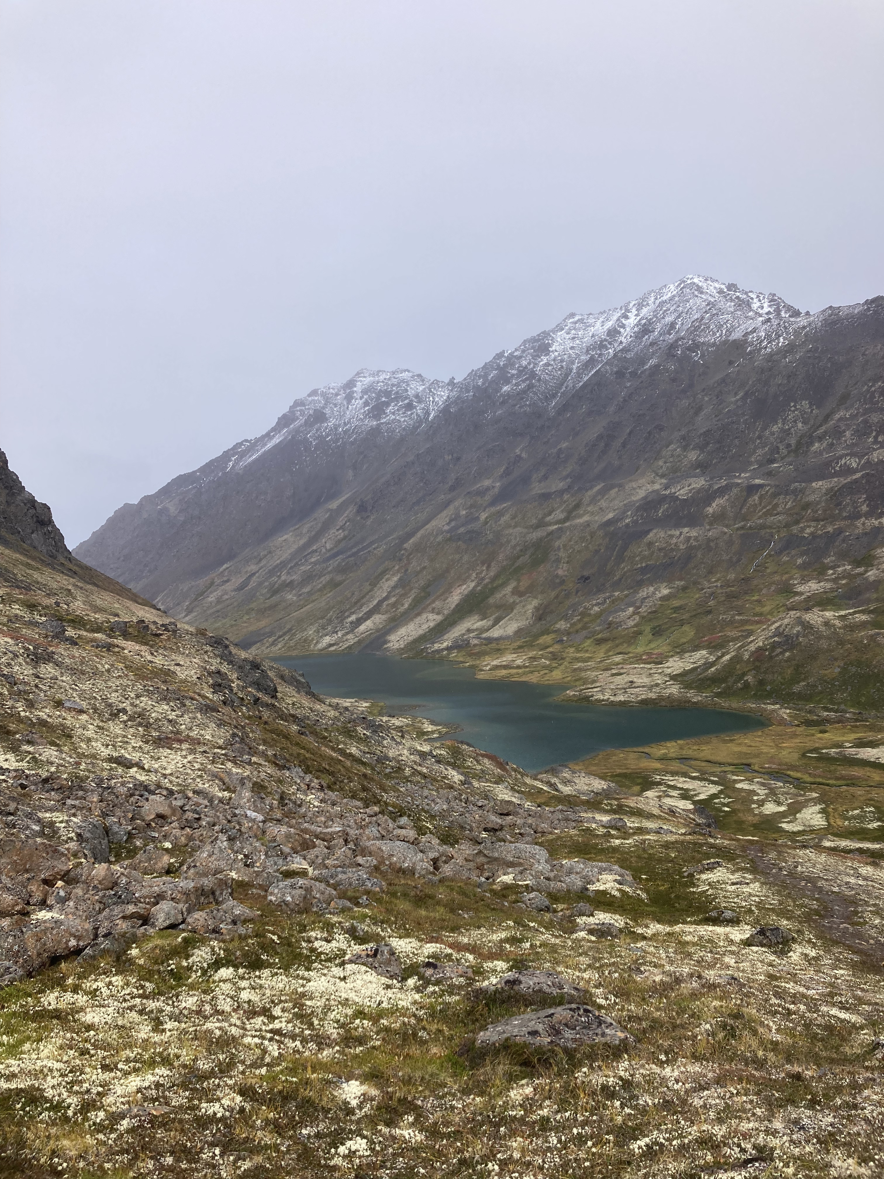 So i'm recording this at the end of the day while in my sleeping bag, we got started at 11am and stopped hiking around 6 pm. Overall it was pretty good, it was kind of wet as we were moving through the trees and the open fields, but the trees soon thinned out. There is a really pretty section of trail (the end of Middle Fork Loop Trail) just before the bridge where the trees are nicely framing the trail. When We got onto the Williwaw Lakes Trail, after an hour or so, Someone spotted sheep up on the mountain, I don't know how they spotted them because they’re literally just these tiny white dots on the mountain side. Continuing on at some point we made a “river crossing” around the first of the Williwaw lakes, supposedly there was another place deeper in the valley where we could have made a river crossing but I now understand why we didn't, its was so wide it was basically another lake (but its was really shallow). After the river crossing we continued on and saw more sheep on the mountain. It was around here that I started slowing down a lot. We routed to the northside of the big lake with a seagull nest on the big rock. The north west side of the lake is cool because the meandering creek forms a braided stream micro forests or fresh water tide pool sort of environment. Around this point I was going about a mile an hour and dragging ass. There was a bear that ran out in the distance that I just missed because I was too far back
