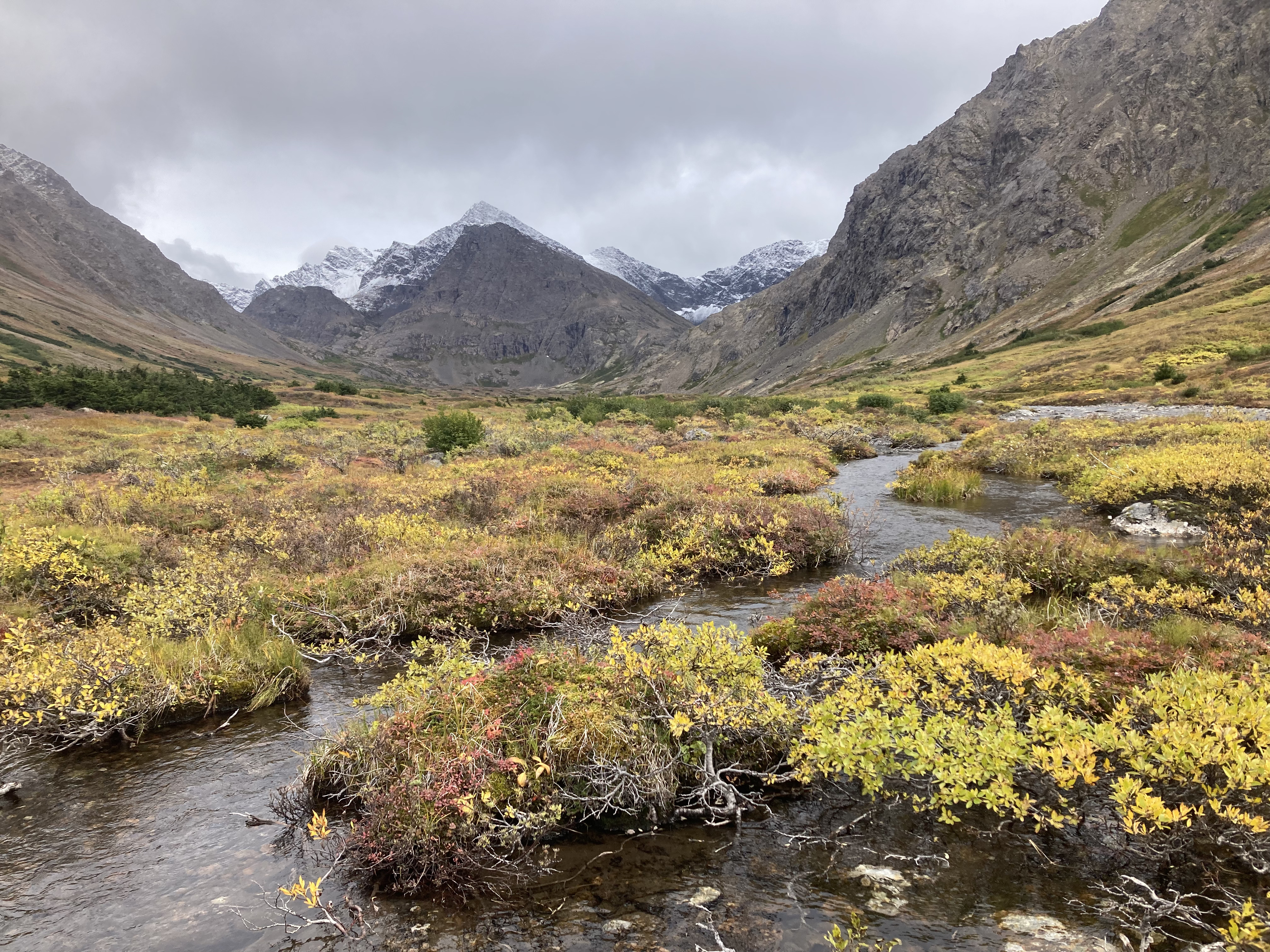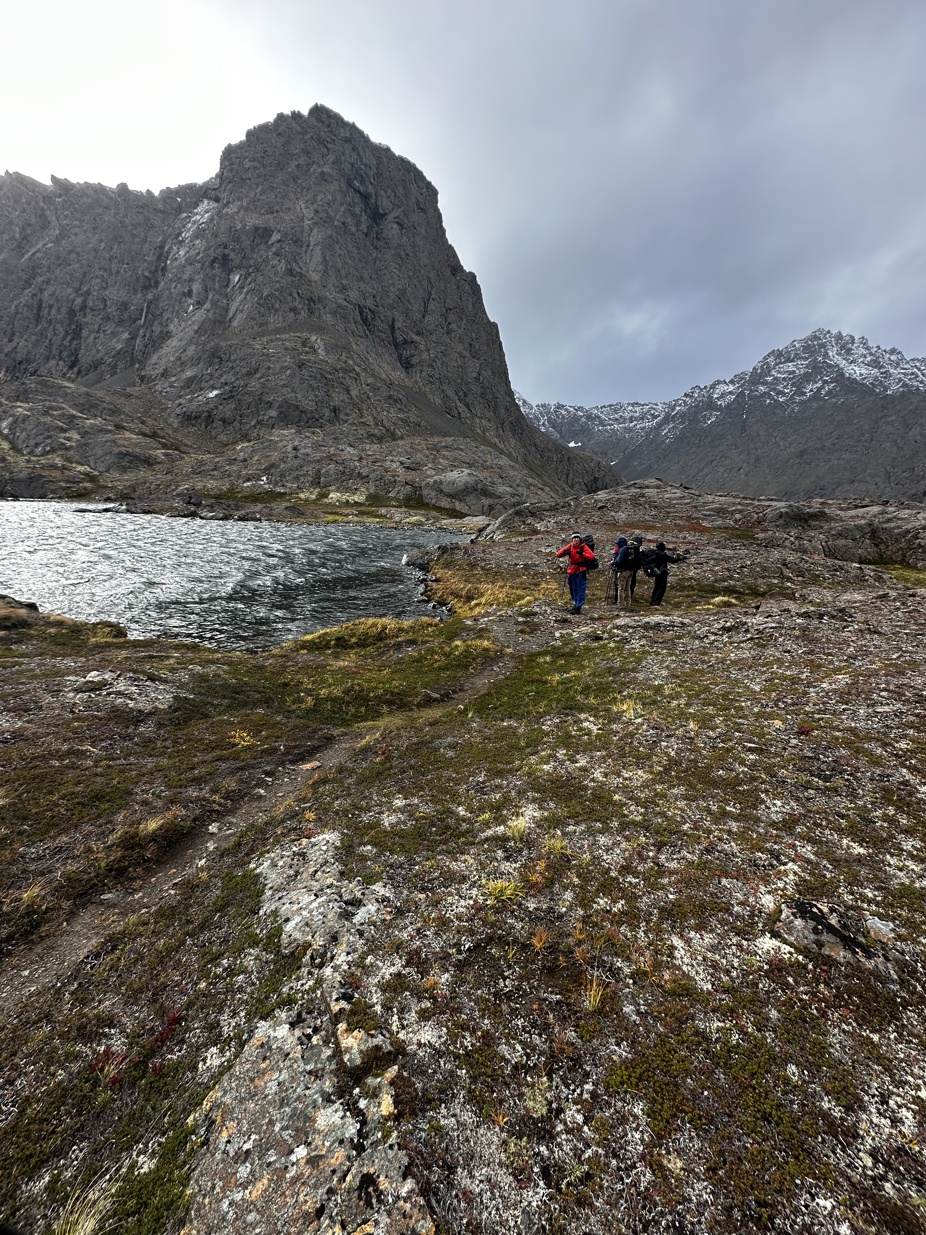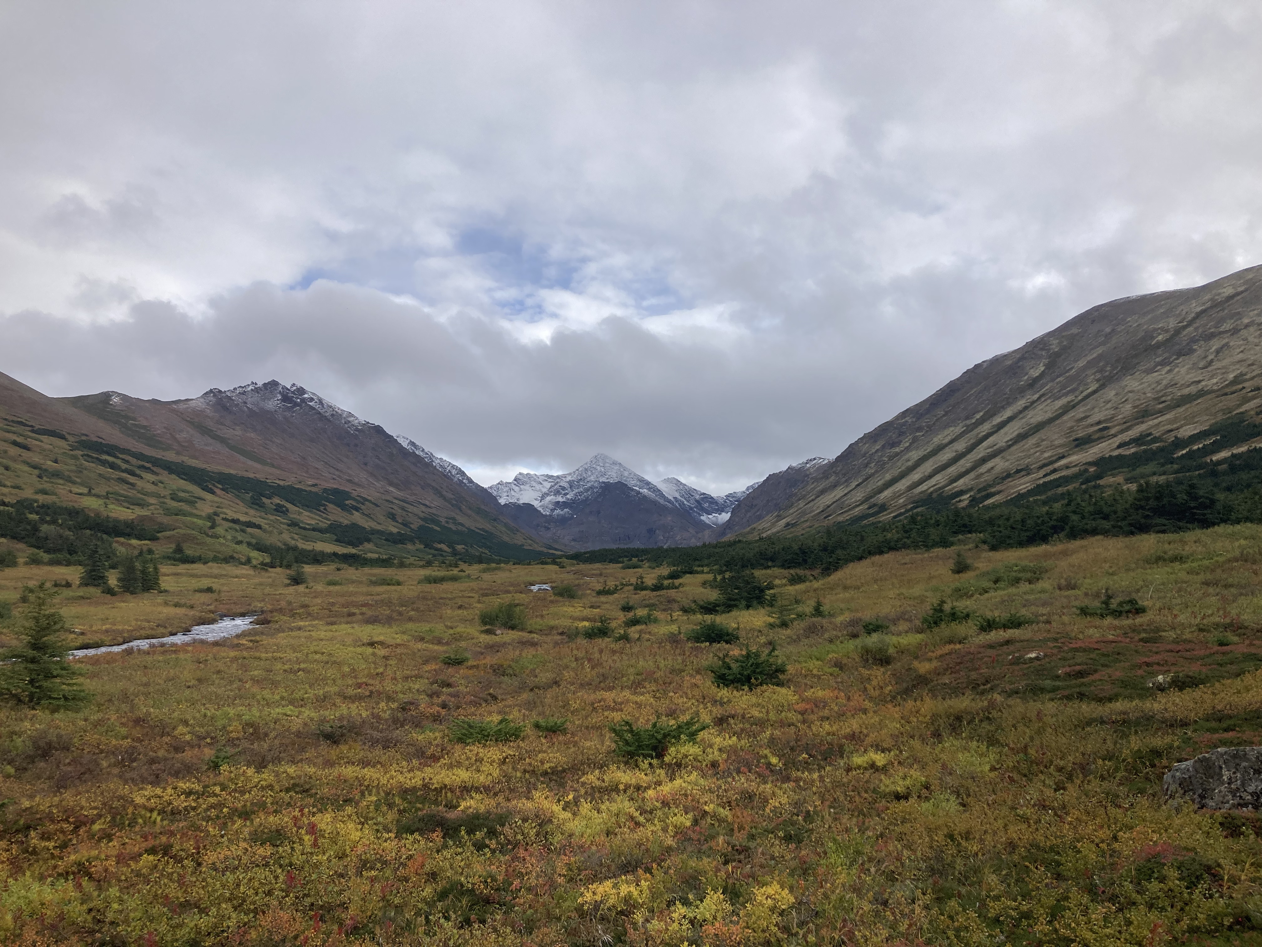 So i'm recording this at the end of the day while in my sleeping bag, we got started at 11am and stopped hiking around 6 pm. Overall it was pretty good, it was kind of wet as we were moving through the trees and the open fields, but the trees soon thinned out. There is a really pretty section of trail (the end of Middle Fork Loop Trail) just before the bridge where the trees are nicely framing the trail. When We got onto the Williwaw Lakes Trail, after an hour or so, Someone spotted sheep up on the mountain, I don't know how they spotted them because they’re literally just these tiny white dots on the mountain side. Continuing on at some point we made a “river crossing” around the first of the Williwaw lakes, supposedly there was another place deeper in the valley where we could have made a river crossing but I now understand why we didn't, its was so wide it was basically another lake (but its was really shallow). After the river crossing we continued on and saw more sheep on the mountain. It was around here that I started slowing down a lot. We routed to the northside of the big lake with a seagull nest on the big rock. The north west side of the lake is cool because the meandering creek forms a braided stream micro forests or fresh water tide pool sort of environment. Around this point I was going about a mile an hour and dragging ass. There was a bear that ran out in the distance that I just missed because I was too far back