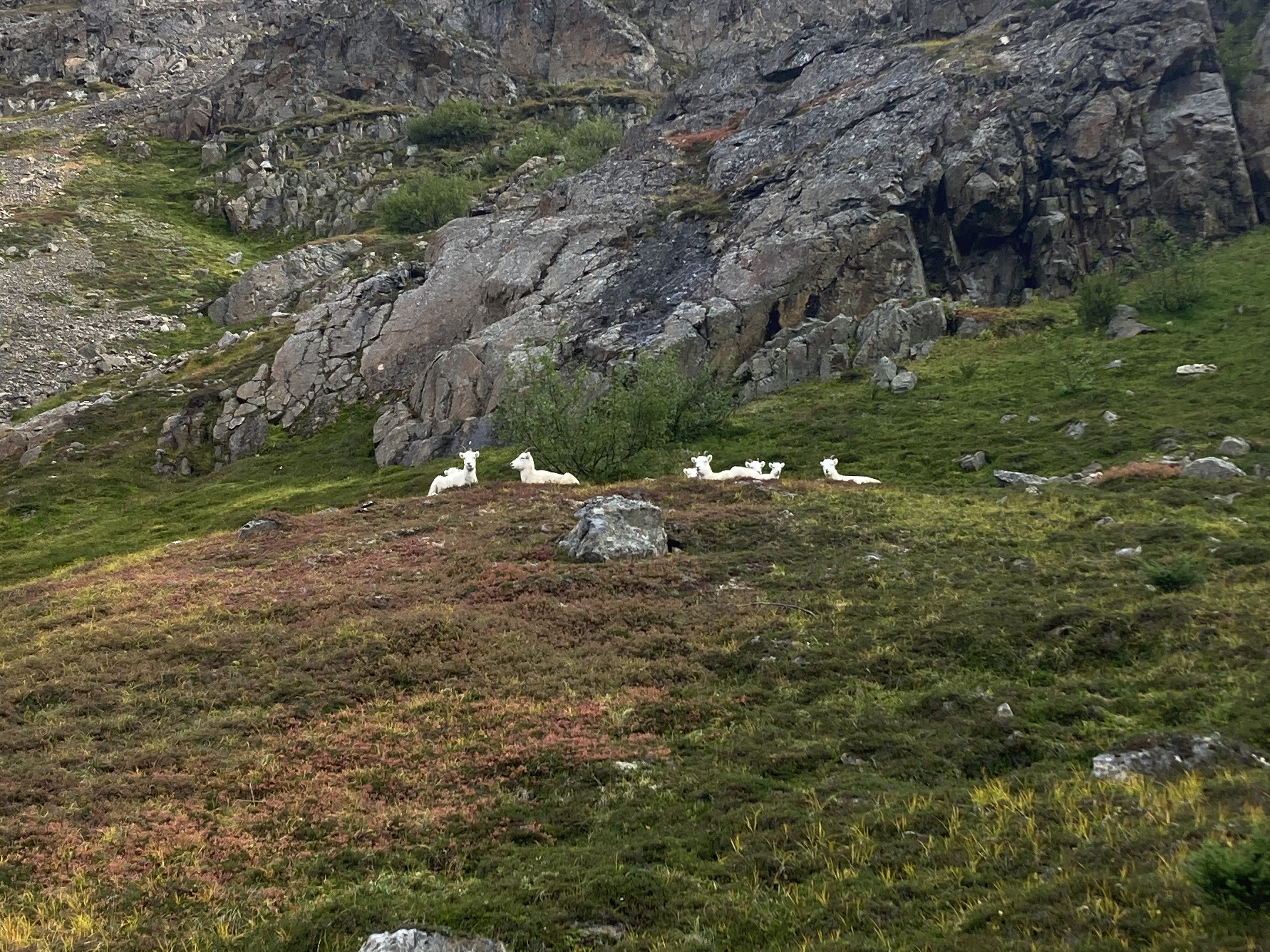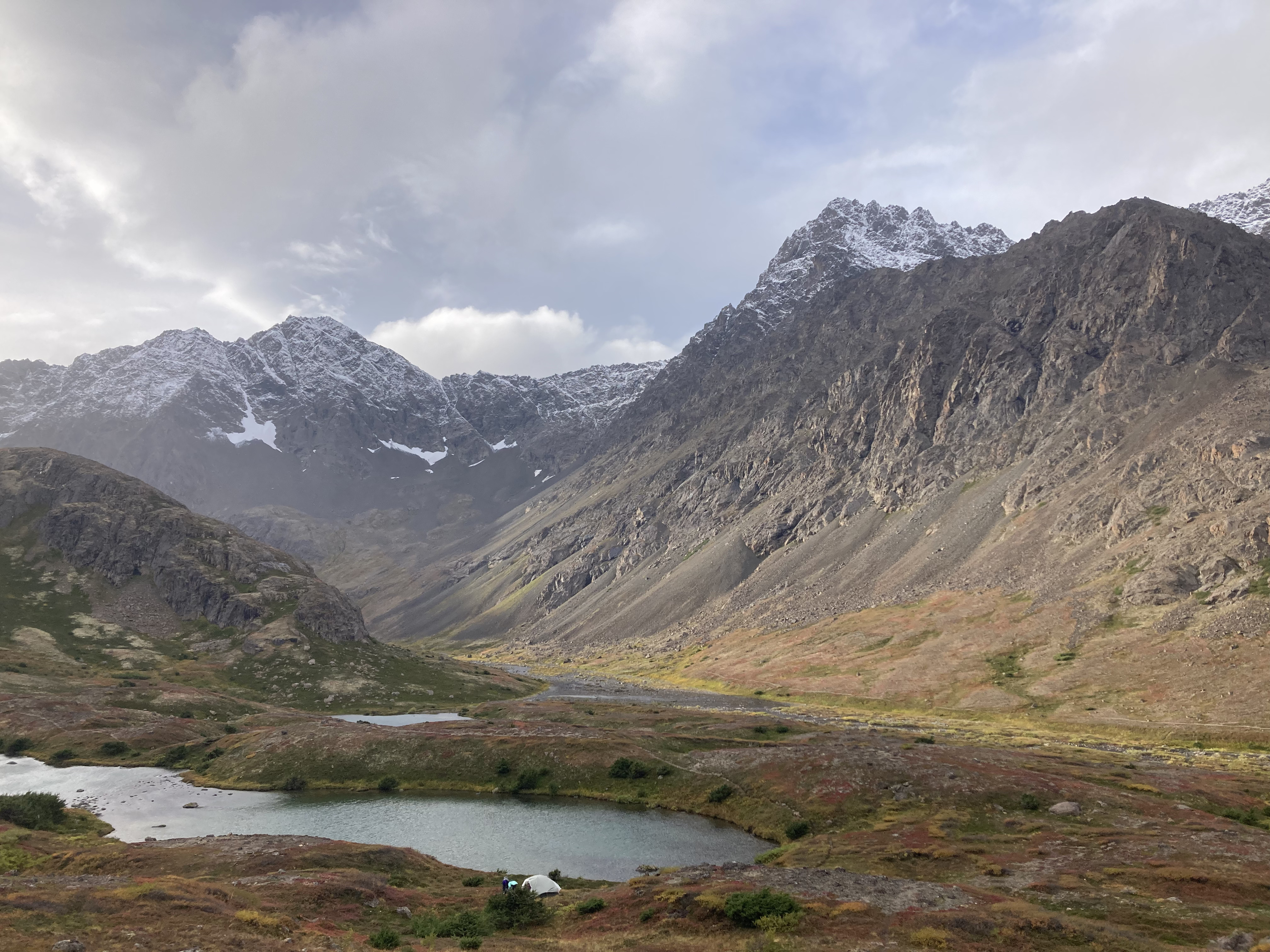 We eventually get to the chicken drumstick cooking lake and set up camp and ate dinner (I ate mac and cheese, macadamia nuts, and chocolate). After finishing dinner I had the terrible task of cleaning my pots and the water was so cold (because of this I now bring a sponge rather than scrub my bare hands in the freezing water to clean my pot). I hung out with the other campers for a little bit, boiled some water, and now have my hot water bottle in my sleeping bag (I have gotten addicted to this, it is tooo easy). I had to go to bed because I couldn't stay outside any longer, it was too windy and cold.There is a third herd of sheep that are really close to us and seemingly venturing further down the mountain toward our camp. The snow on the mountains has me worried and I fear that we will be snowed on during the night. Maybe we can get all the way back to Anchorage by Saturday night.